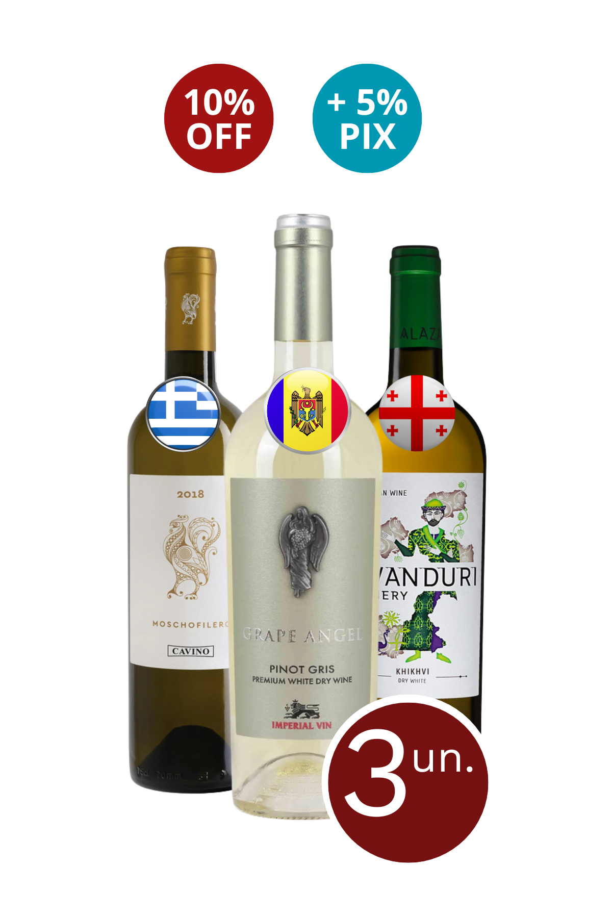 Vinhos Grape Angel Premium Pinot Gris (Moldávia), Peloponnese Moschofilero PGI (Grécia) e Avanduri Khikhvi (Geórgia)